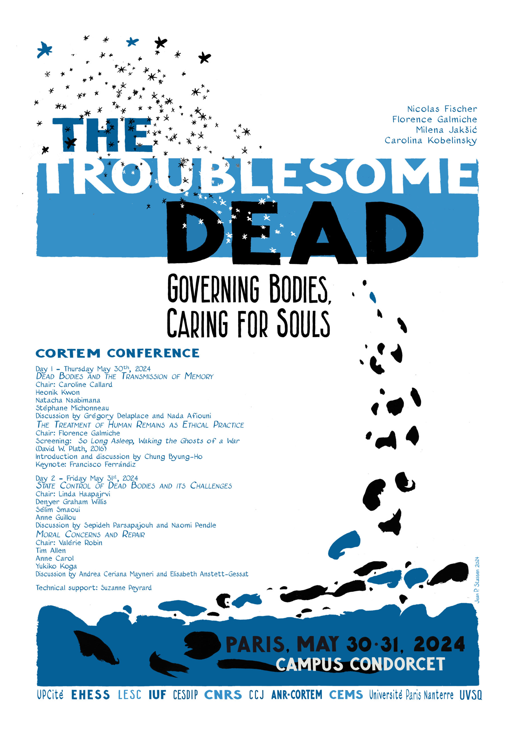 C’est avec grand plaisir que nous vous invitons à assister au colloque international The Troublesome Dead. Governing Bodies, Caring For Souls organisé par l’ANR CORTEM (Les corps-témoins. Pour une sociologie politique du traitement des restes humains) et soutenu par le CESDIP les 30 et 31 mai 2024, sur le site du Campus Condorcet (Paris-Aubervilliers). La langue de travail de ces deux journées sera l’Anglais.